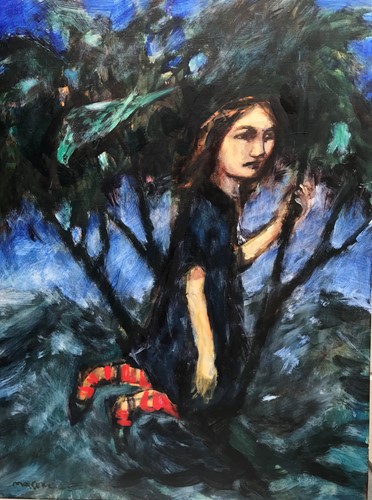 For a time, we lived in a bay in Pittwater, north of Sydney. Being one of the larger yachts, we were assigned a mooring further out in the bay, so it was quite a long row ashore, and once there, I spent many hours exploring the bush of Elvina Bay. My favourite place was at the end of the bay where a stream came down a gully and flowed into the shallow water there. On very big tides, the sand banks were well under water and the mangrove trees became islands of green, disconnected from the land with their boughs dipping into the water. Wading out to these sea trees, one could have the unique experience of climbing up and being in the canopy of a tree that was literally growing out of the water. It was like a world unto itself, birds would come and go, and there was the added melancholy charm of knowing the tide would soon ebb and the spell broken. The idea of the sea tree emerged for a while in writing my picture book, Hasel and Rose, I have drawings of the tree travelling across oceans with Hasel and Rose riding in the leaves. This idea did not make it into the book, but returned in this painting of a girl in her travelling socks on a sea voyage with a bird.